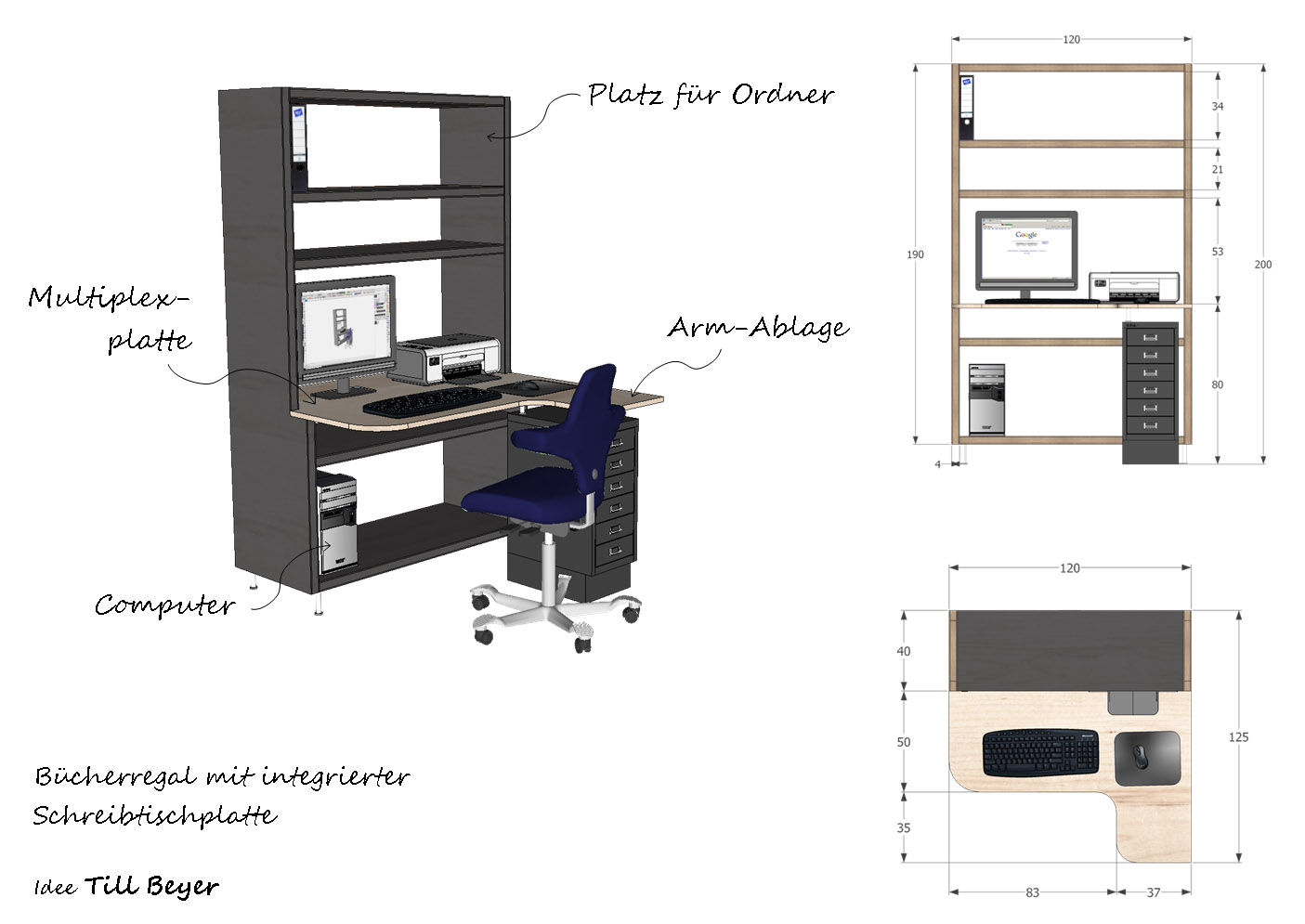 Dieses Computerregal ist aus der Not heraus entstanden. Manchmal ist in der Wohnung einfach kein Platz mehr für einen richtigen Arbeitsplatz. Deshalb habe ich mir für mein Ikea-Regal eine Arbeitsplatte aus Multiplex zuschneiden lassen. Das Schöne an der Arbeitsplatte ist, dass man seinen Arm bequem ablegen kann. Da lässt sich die Computermaus ganz entspannt bewegen.