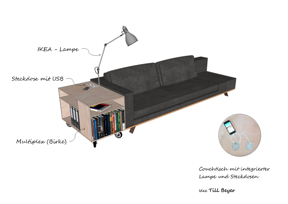 Wen nervt das nicht, da sitzt man gemütlich auf der Couch und das Handy ist mal wieder leer. In diesem einfachen Couchtisch aus 12mm Multiplexplatten sind 2 Steckdosen mit USB-Ladeanschluss integriert. Platz für die Lieblingsbücher und genügend Abstellfläche für den Kaffee ist auch vorhanden. Und endlich steht auch die Lampe fest.