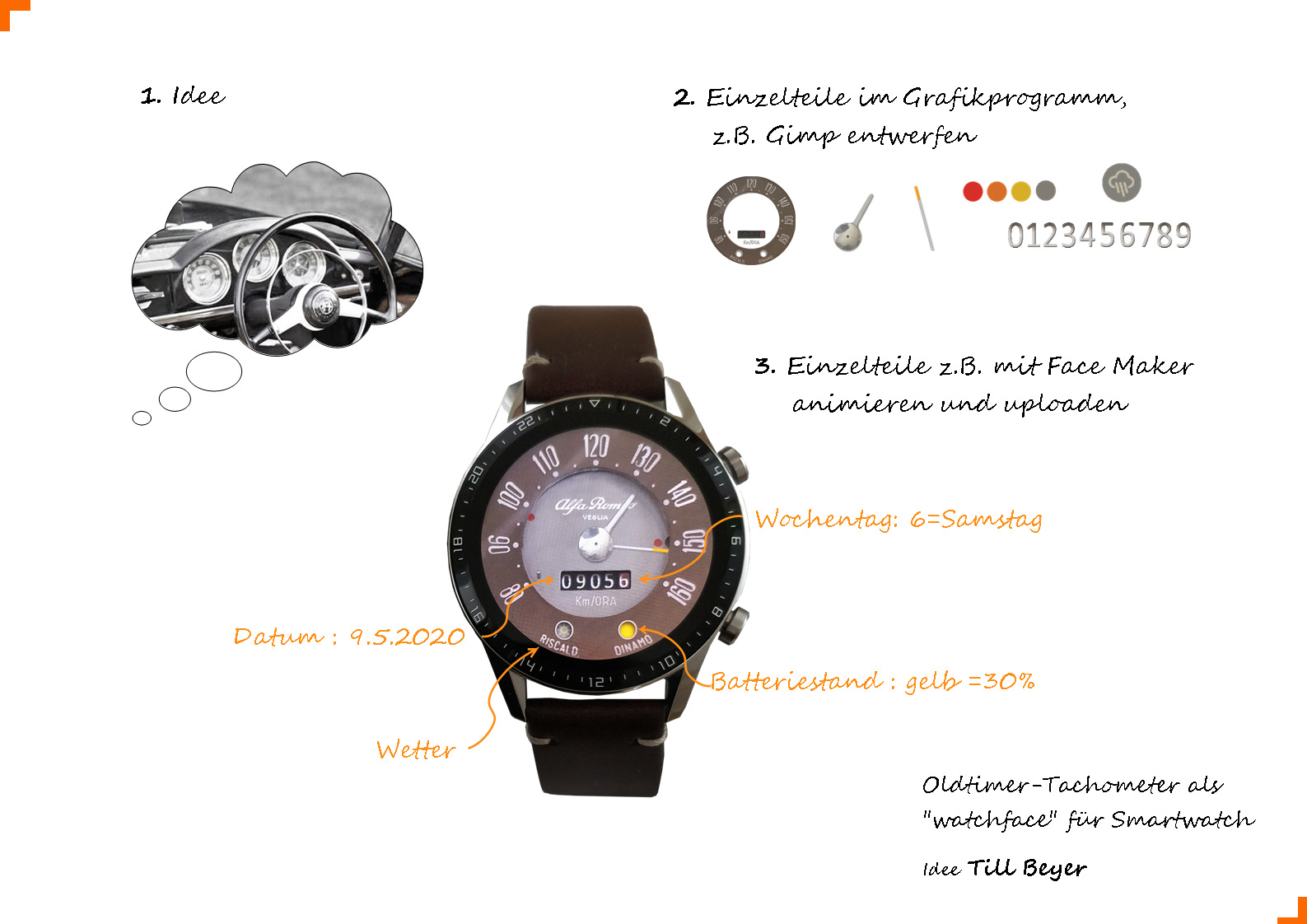Bisher fand ich ja Smartwatches nicht so schön. Aber dass man bei einigen Uhren die Ziffernblätter selber gestalten kann, hat mich fasziniert. Also habe ich erst einmal mit einem Uhrendesign-Programm ausprobiert, wie das funktioniert. In meinem Fall habe ich das Programm Face Maker v0.8.5 genommen. Einfach toll, was man damit machen kann. Dann habe ich mir die passende Uhr dafür gekauft, eine GT 2. Und dann war da diese Idee, aus einem alten Tachometer eine Uhr zu machen. Einen Oldtimer habe ich leider nicht ... aber jetzt immerhin die Uhr dafür.