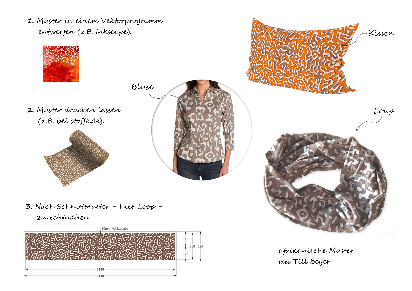 Seit kurzem beschäftige ich mich mit dem Design von Stoffmustern. Besonders afrikanische Musterstrukturen faszinieren mich. Dabei haben es mir besonders die Muster der Kuba und Shoowa (Volksstämme im Kongo) angetan. Diese Muster leben von der Ambivalenz zwischen Ordnung und Chaos, jedes Teil des Musters ist individuell und doch ist eine Gemeinsamkeit und Harmonie zu erkennen.